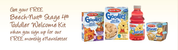 You can get a great free Beech-Nut stage 4 toddler kit when you sign up for the e-Newsletter! Fill out the form and you will get your welcome kit by mail.